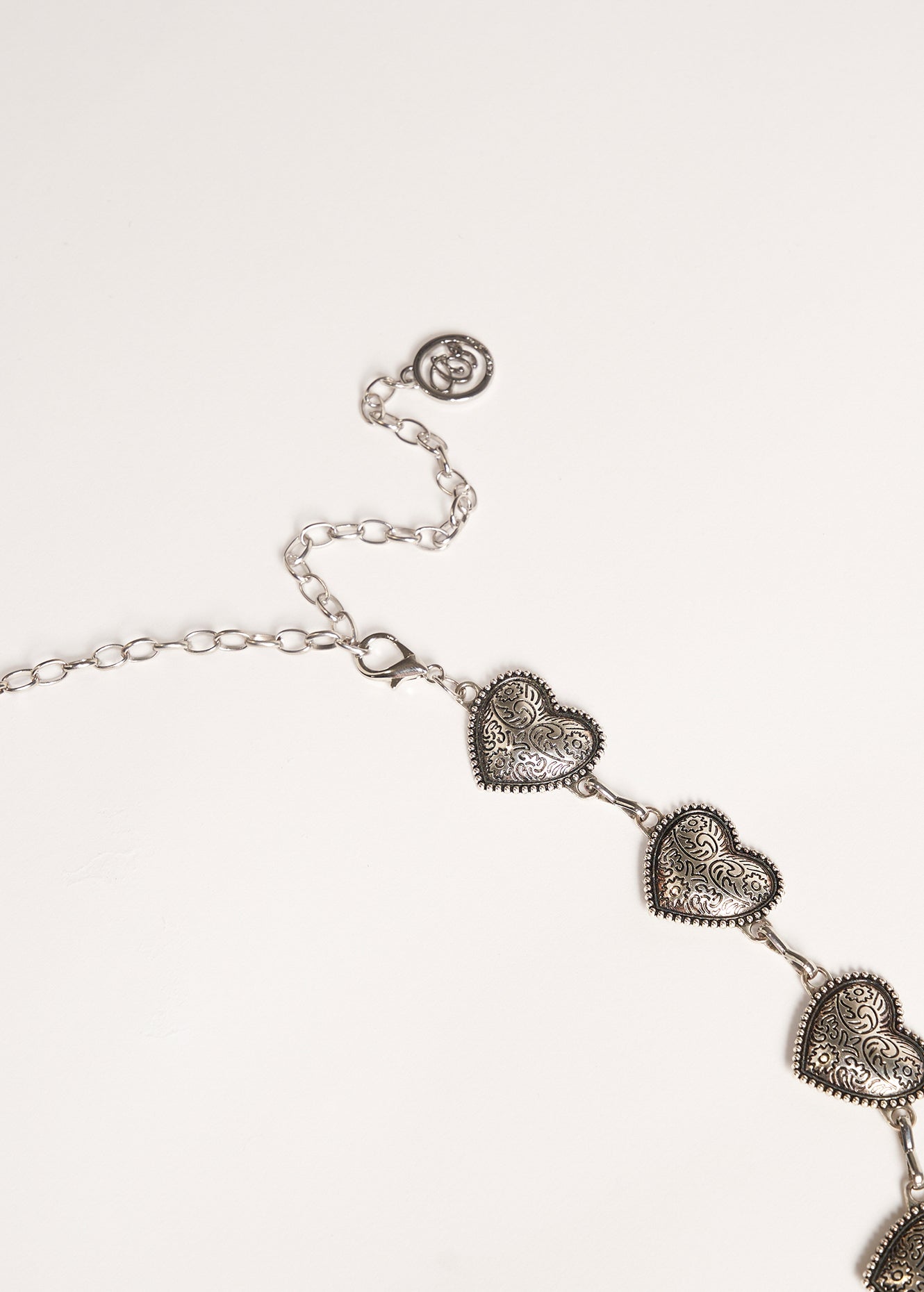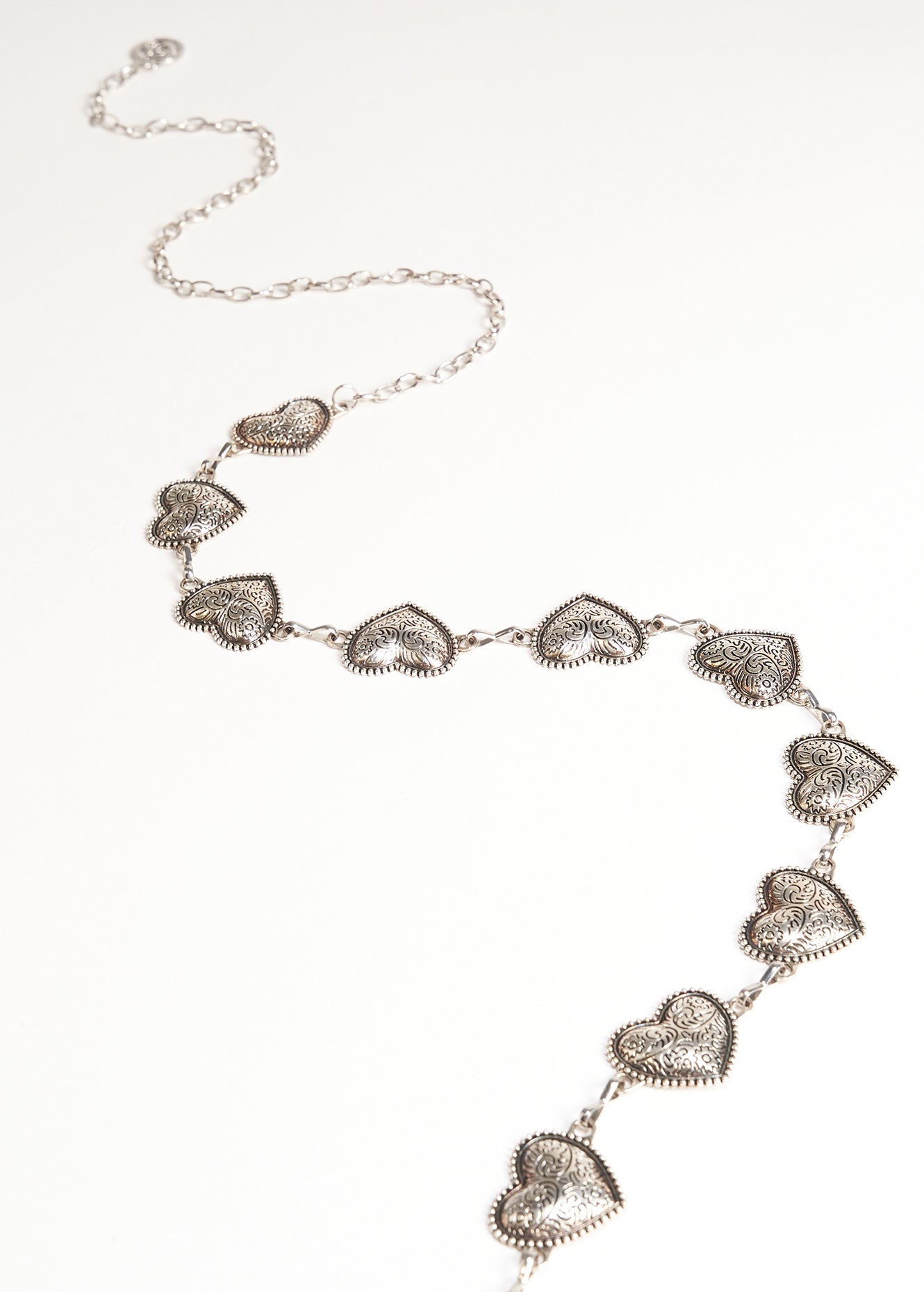 La cintura Clare è una catena in finitura silver con cuori lavorati che aggiungono un tocco romantico e luminoso al look. Perfetta per valorizzare un abito o segnare il punto vita su una giacca o una maglia lunga. Lunghezza 110 cm altezza 3 cm.