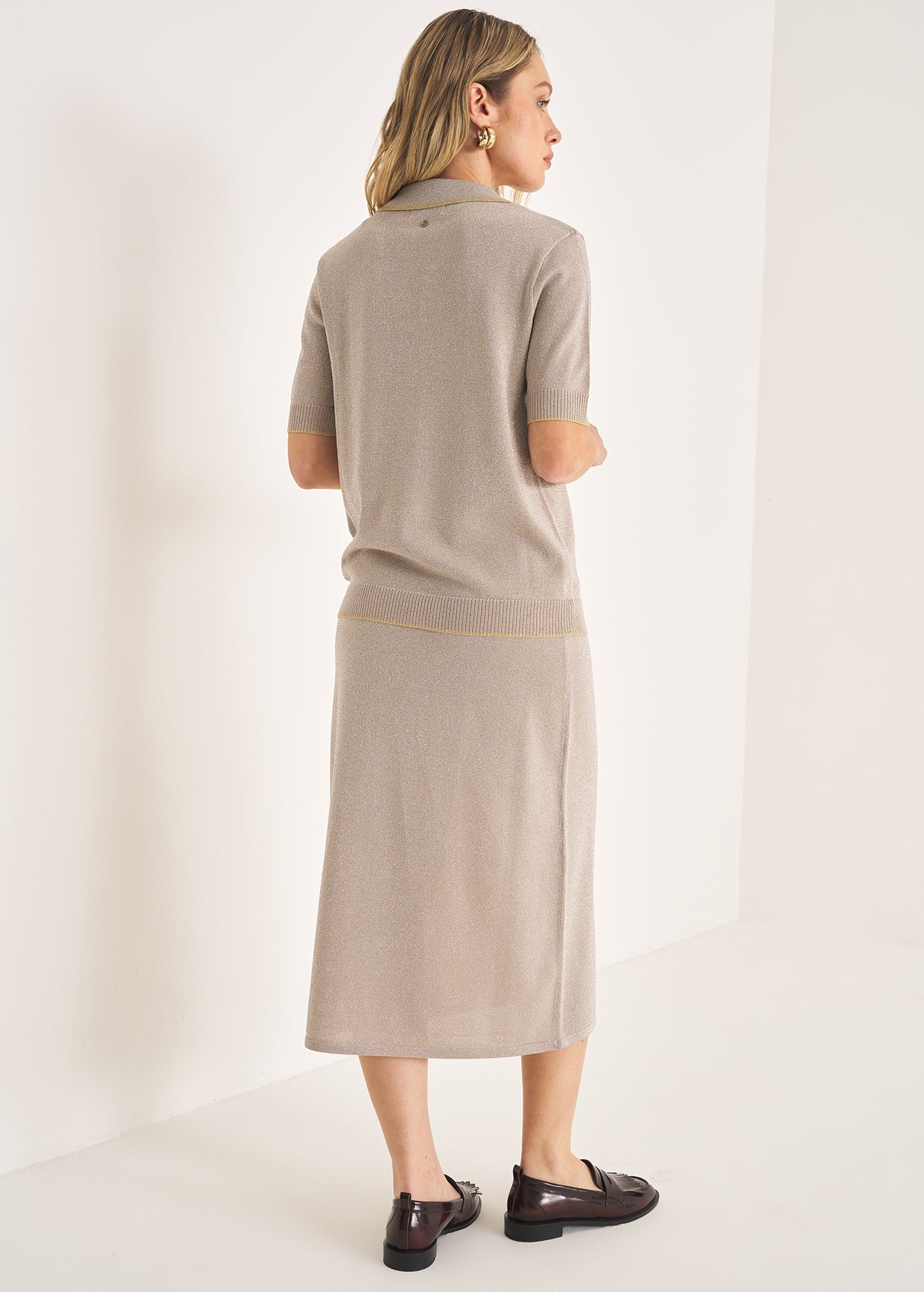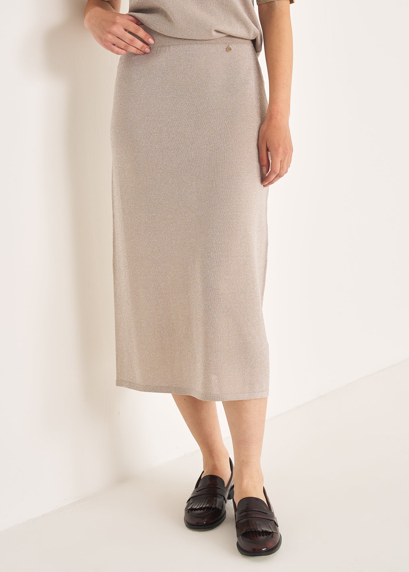 La gonna Ginevra in maglia lurex a vita alta e lunghezza media dona luce e raffinatezza al look. Coordinata con la t-shirt Sidney crea un completo sofisticato perfetto per l’autunno. Indossala con mocassini per un tocco preppy e contemporaneo. La modella è alta 1 77 e indossa una 42.