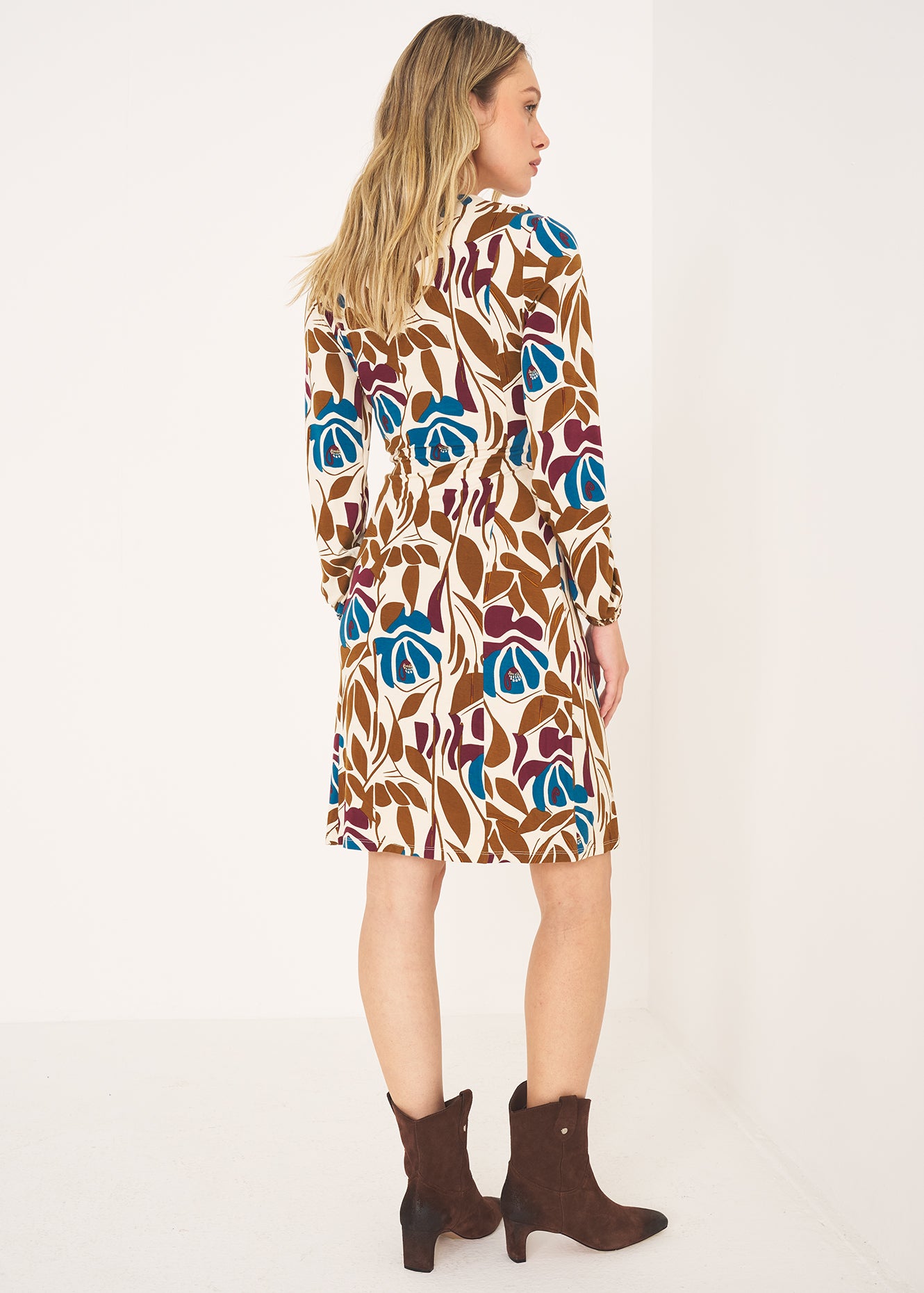 L’abito Azur in jersey con stampa floreale conquista con il suo finto incrocio e lo scollo a V che valorizza il décolleté. Le maniche lunghe lo rendono perfetto per l’autunno mentre la linea fluida accompagna la figura con eleganza e comfort. La modella è alta 1 77 e indossa una 42.