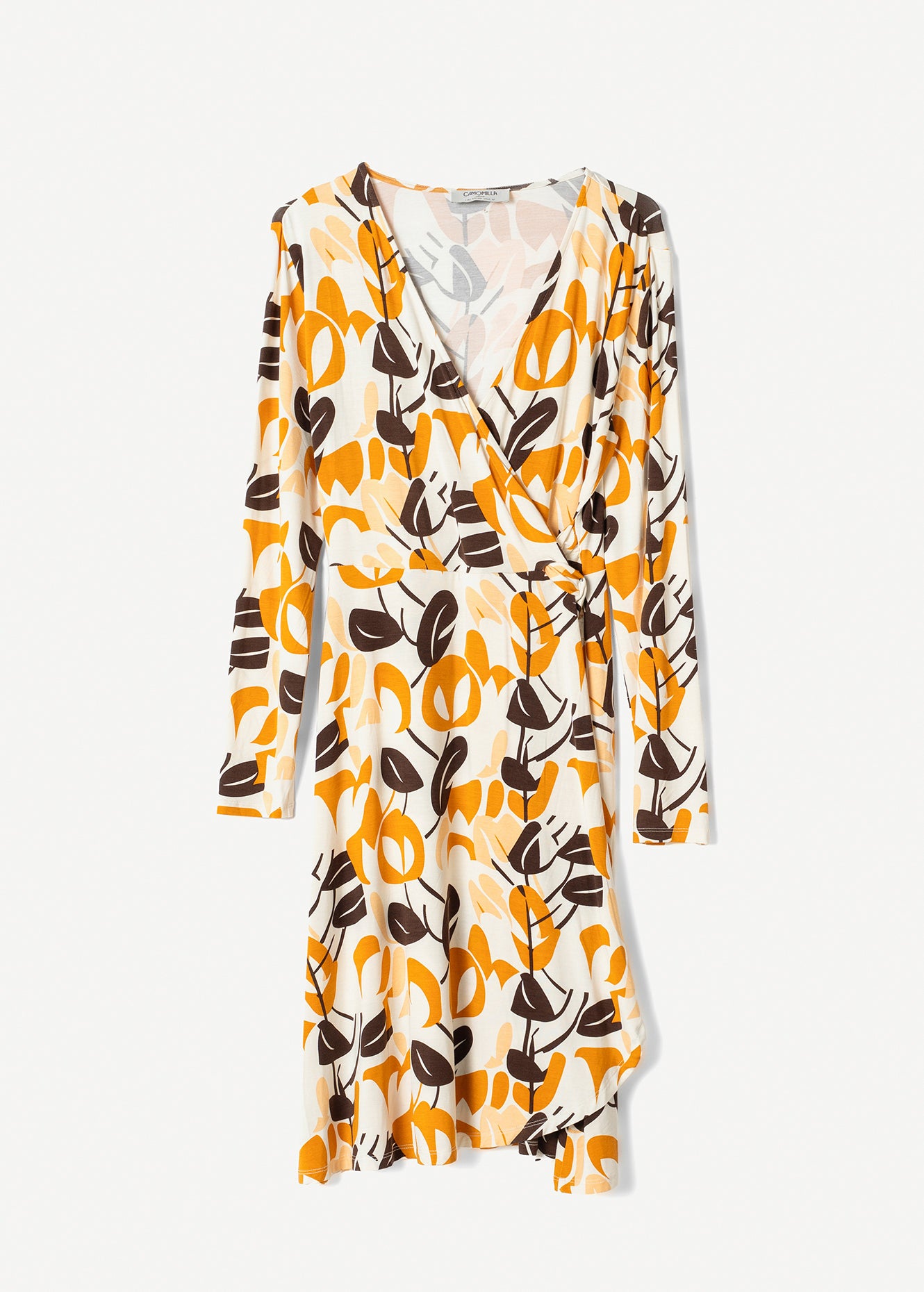 L’abito Amor in jersey con stampa foglie è perfetto per dare carattere ai look autunnali. Lo scollo a V con bottoncini le maniche lunghe e la cintura in vita valorizzano la figura con naturalezza. Una proposta femminile e confortevole per ogni momento del giorno. La modella è alta 1 77 e indossa una 42.