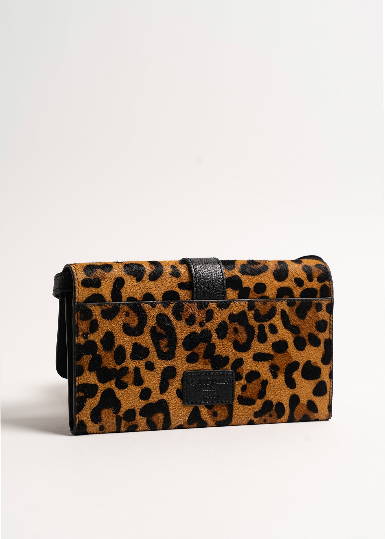 La Buffy-A in 100% vero cavallino con stampa maculata è la compagna ideale per le tue serate in città. La patta in pelle con fibbia decorativa e la tracolla removibile la rendono versatile: staccandola si trasforma in un pratico portafogli con scomparto portacarte. Dimensioni: 18 5 × 11 × 1 5 cm.
