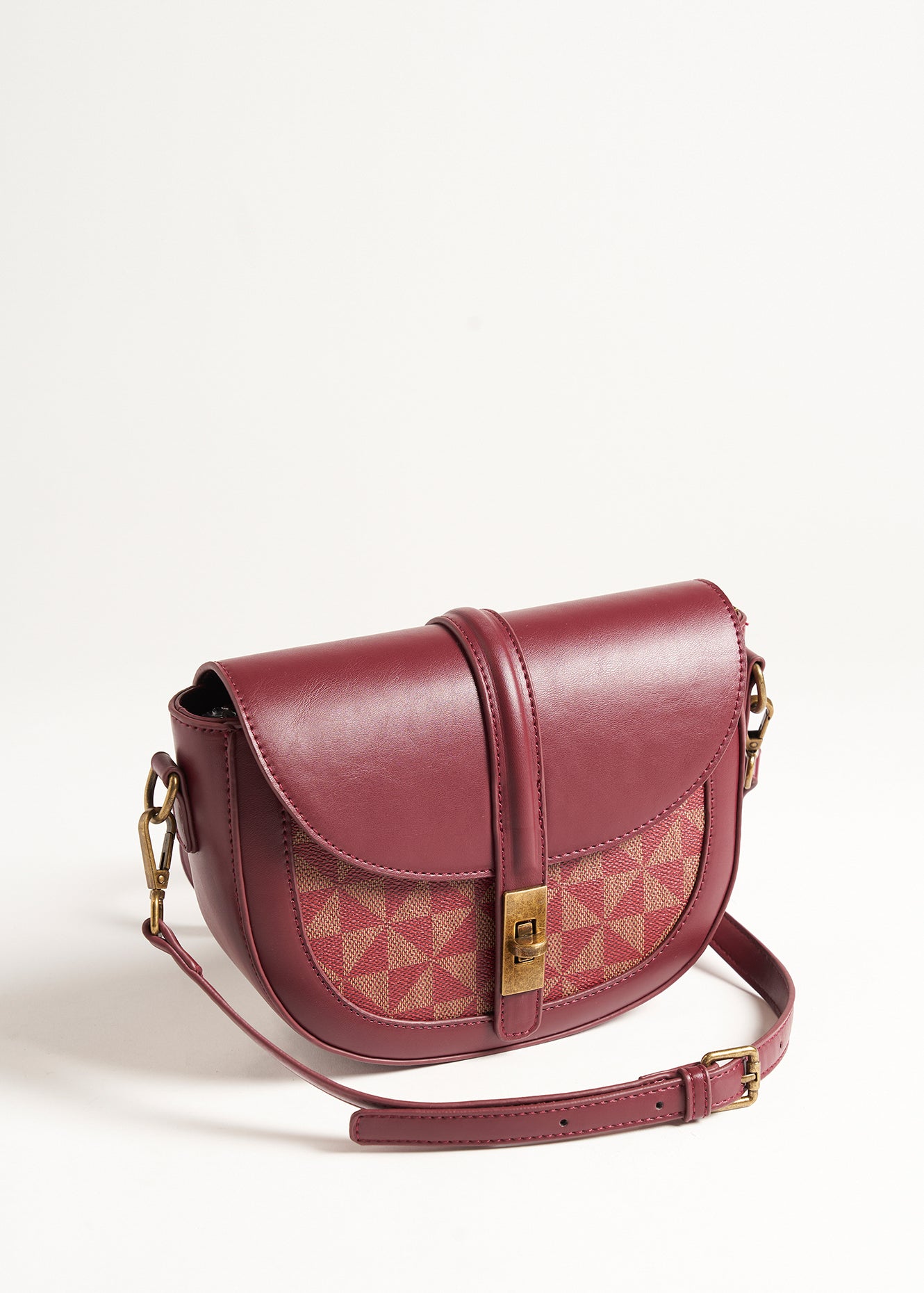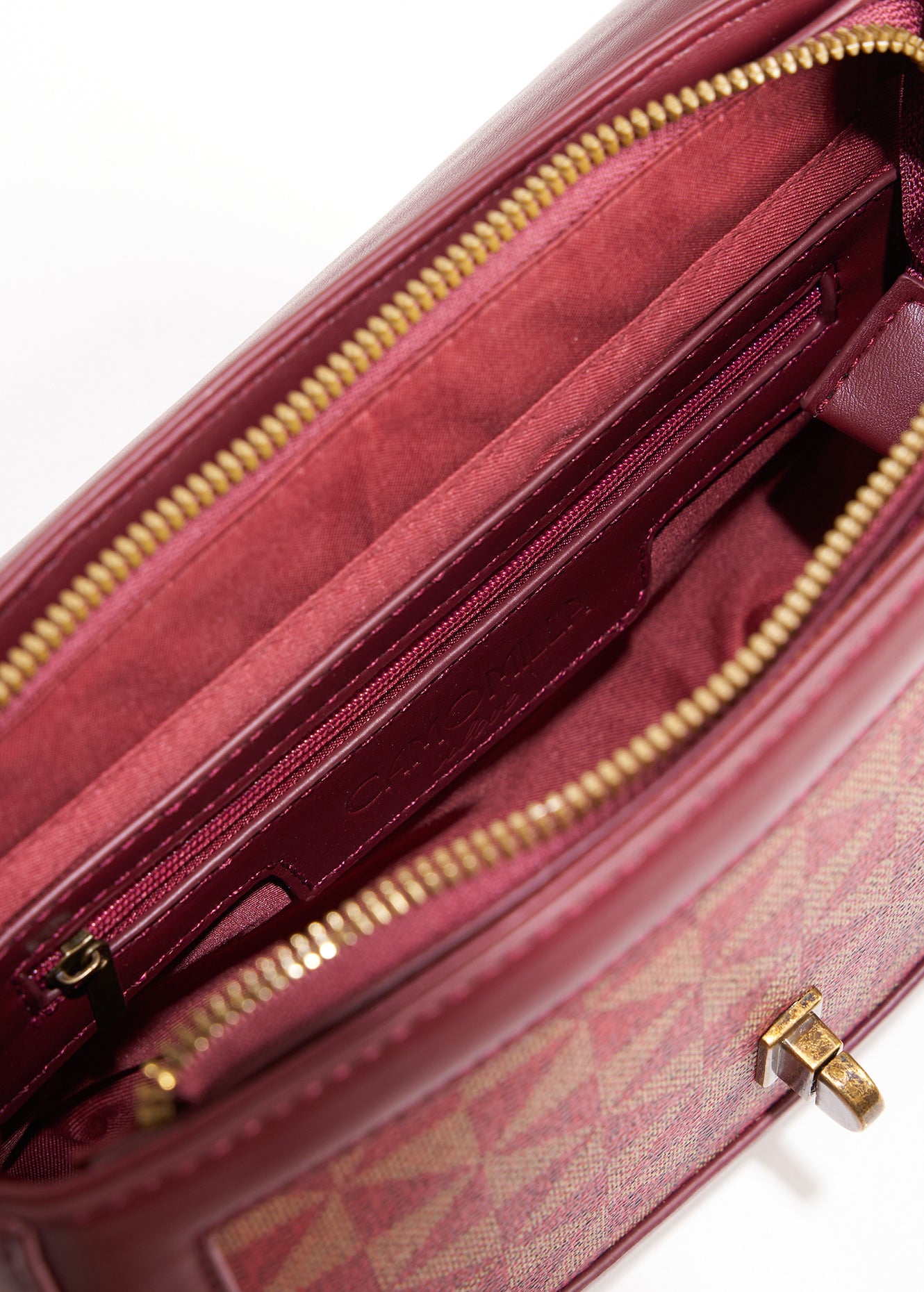 Bonye è una tracolla compatta in ecopelle fantasia geometrica con riporti in tono e dettagli in metalleria ottonata. La chiusura a battente con girello e zip interna la rende sicura e funzionale. Ricorda uno stile parigino d’ispirazione vintage. Dimensioni: 22 x 15 x 7 cm.