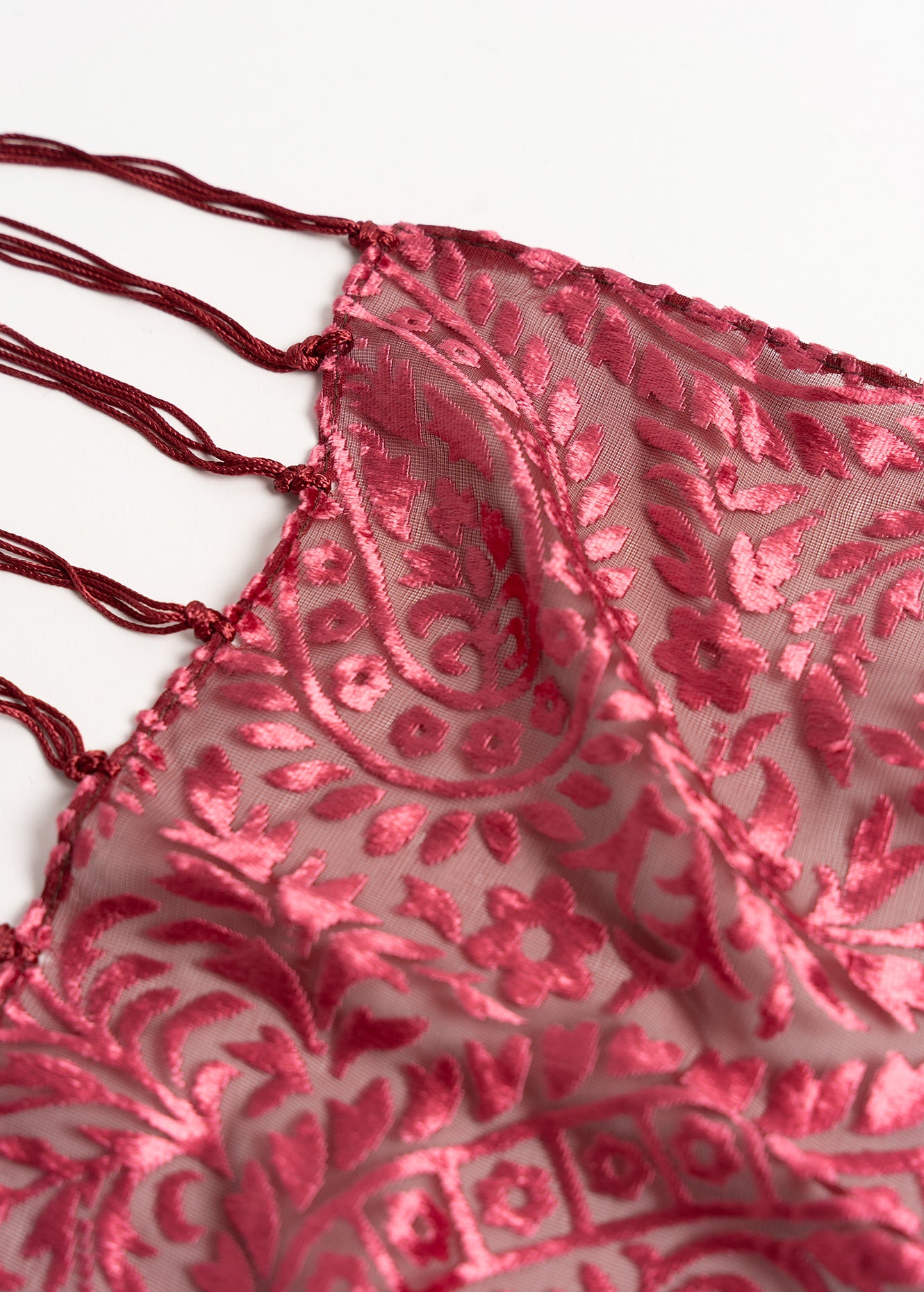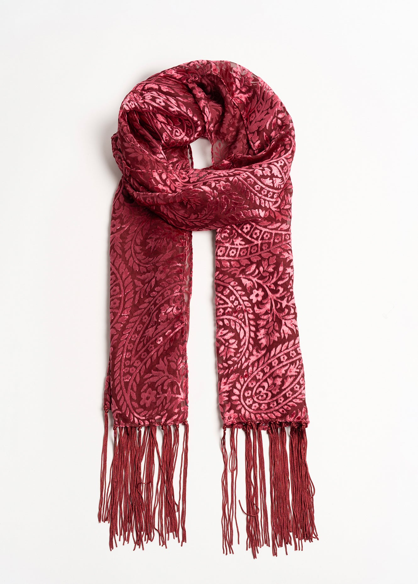 La sciarpa Shana in tessuto semitrasparente con lavorazione devoré tono su tono e frange è elegante e versatile al tempo stesso. Perfetta per impreziosire look serali ma anche per dare un tocco sofisticato a outfit quotidiani. Disponibile in due varianti colore. Dimensioni: 55 × 180 cm.