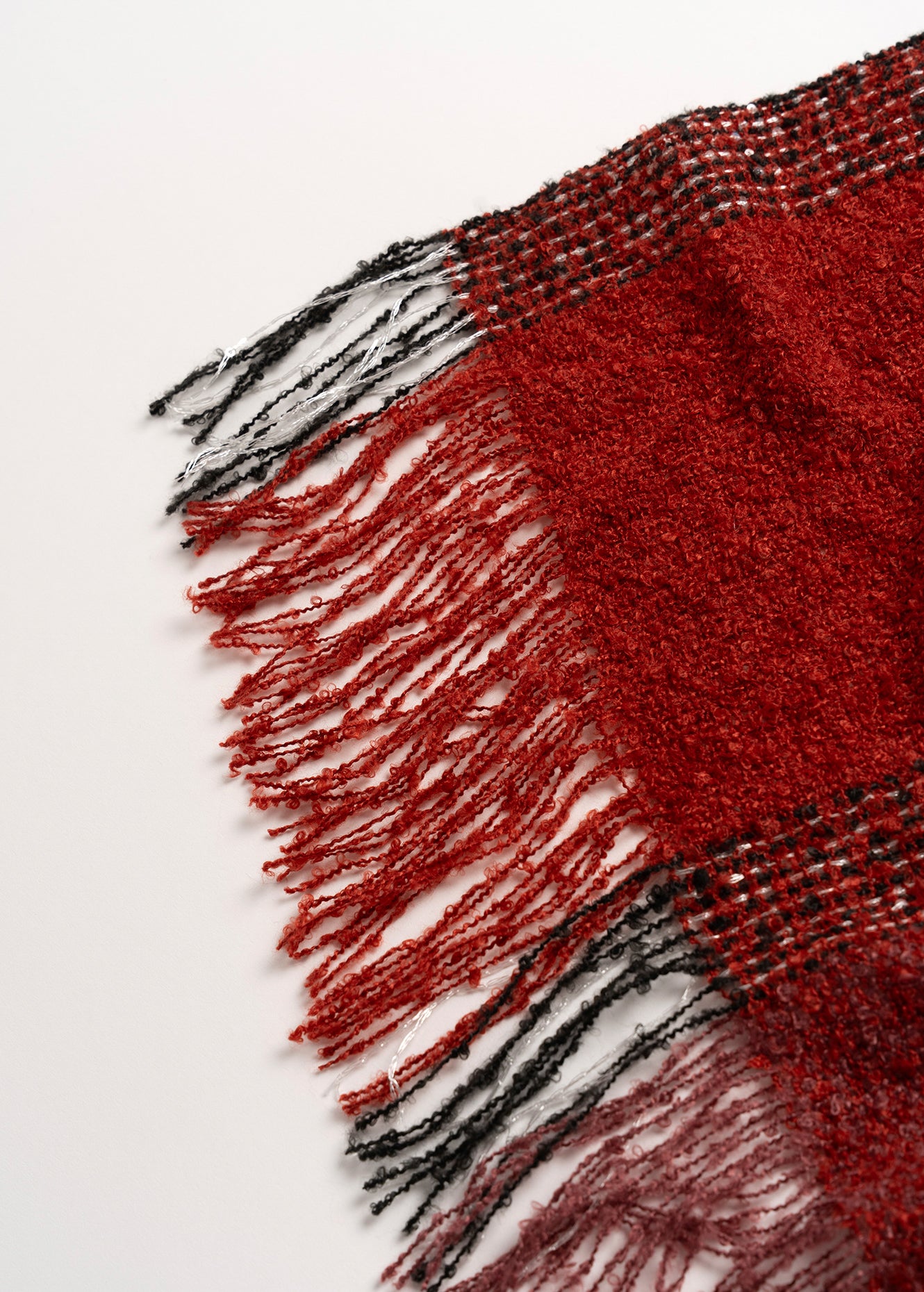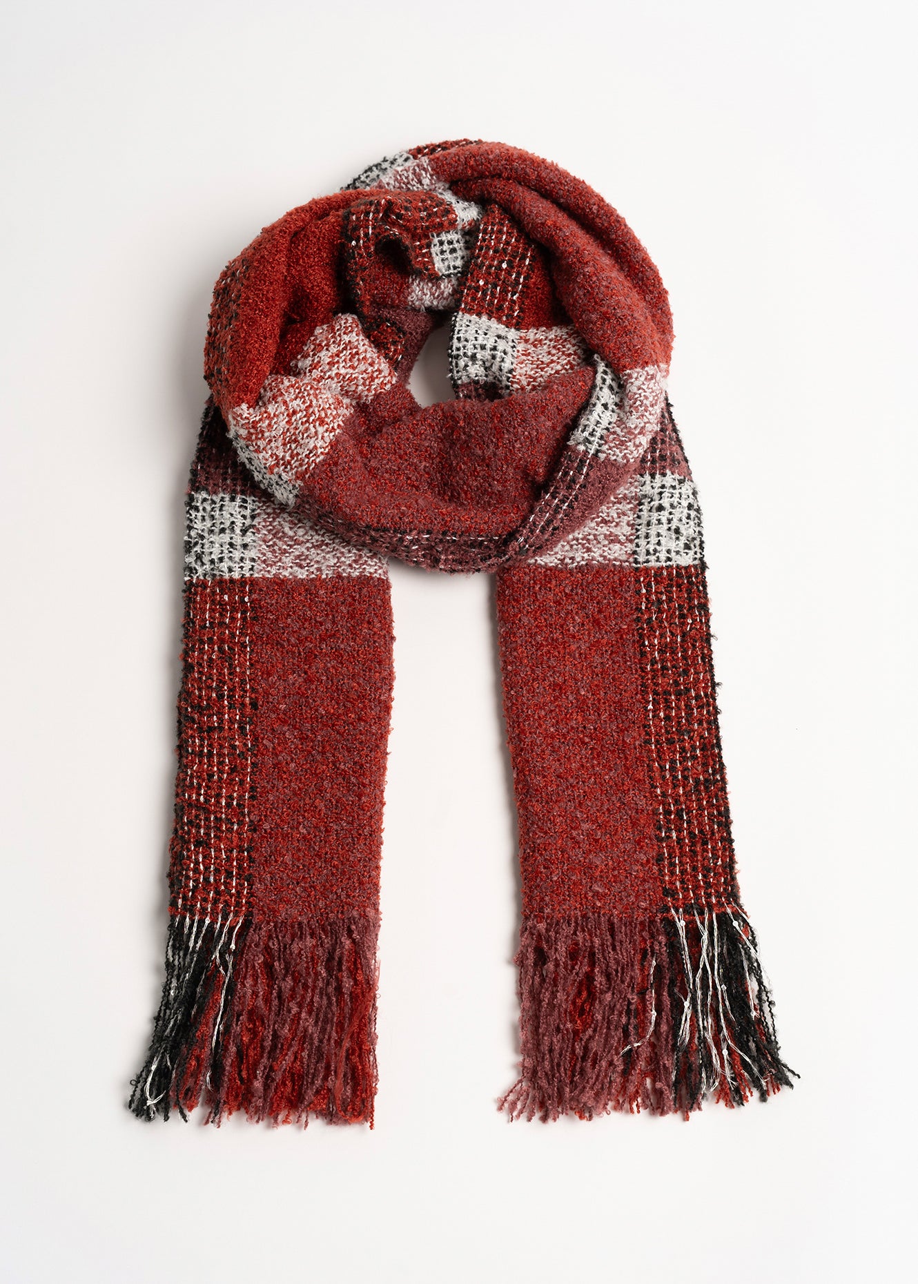 La sciarpa Sonya in tessuto bouclé con fantasia macro check e bordo sfrangiato è lo sciarpone classico che non può mancare nei look casual invernali. Ampia e avvolgente aggiunge calore e stile a cappotti e piumini. Disponibile in due varianti colore. Dimensioni: 50 × 180 cm + 11 cm frange.